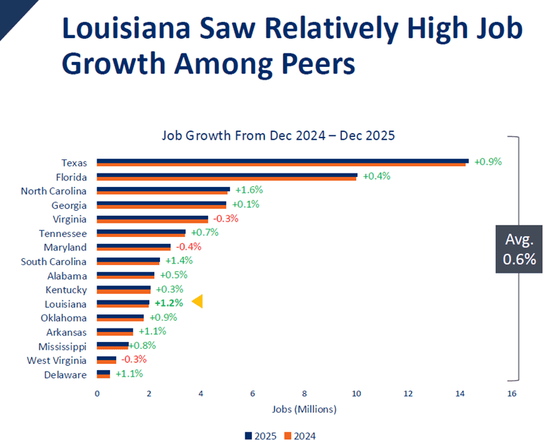 Better Louisiana’s First Quarter 2026 Economic Update highlights encouraging trends across the state’s economy and communities. See Report Here. Louisiana added almost 23,000 jobs in 2025, ranking third in the South for job growth and keeping employment above 2 million for a record eight consecutive months. Job increases stretched across every major region, with Slidell, Baton Rouge, Lake Charles, and Monroe leading the way.